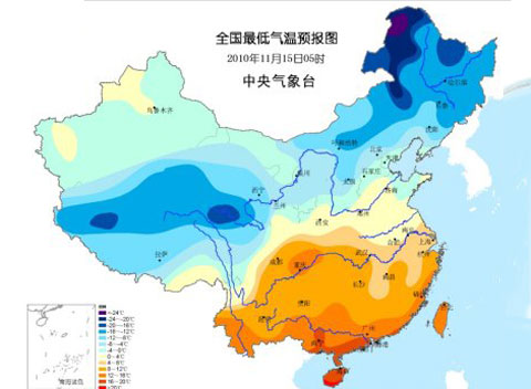 全国最低气温预报图(2010年11月10日20时-12日20时)