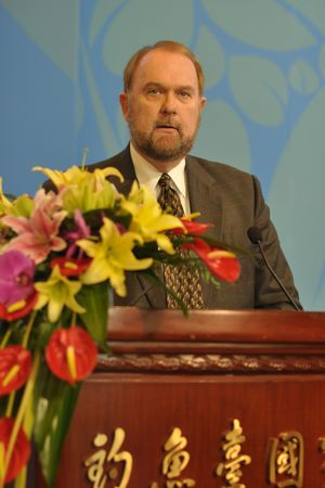 北京大学生命科学学院教授、北京大学大熊猫及野生动物保护中心主任、北京大学崇左生物多样性研究基地主任潘文石做了题为《明智的伦理抉择是安全穿越生存瓶颈的唯一指南》的主旨报告。潘文石指出,现代人在很大程度上依然秉承着智人祖先的本性,还是一个进化尚未完善的相对不变的物种,人类必须建立一种新的文明来改变这种现状,而北京论坛正是在讨论这样的一个重大的问题。他在报告中介绍了近30年来北京大学的科研小组,通过集中研究三种中国独有濒危动物——大熊猫、白头叶猴和中华白海豚的求生策略,并根据它们所在地的自然历史和人类社区的不同情况,制定了保护它们及其栖息地(habitat)生物多样性的方法,使它们逐渐走出困境,逐步恢复正常的生存状态的过程,同时也推动了当地人民生活状况的改善。而通过这30年的实践,潘文石及其研究团队也在启示、教育、视野和信心上得到了巨大的收获。潘文石教授最后说,“30年来,给我们最大的启示是,明白了‘人类无法孤独地行走于天地之间,人类必须与万物众生同生共存’。保护生态多样性的这样一个目标,最终是可以实现的。”