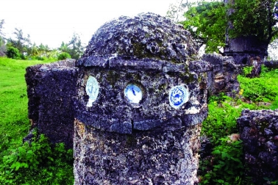 马林迪城北一处墓地上,圆柱形墓碑上镶嵌有中国瓷盘。