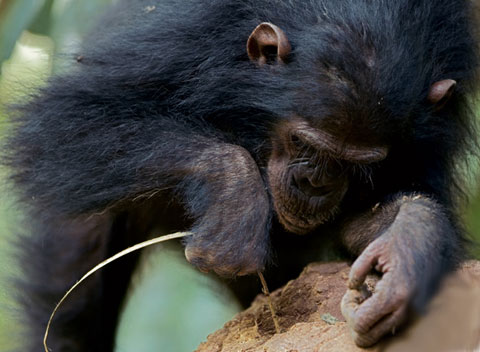 这张摄于2005年的照片中,一只黑猩猩正在捉食美味的白蚁,露出的专注表情与人类颇为相似。