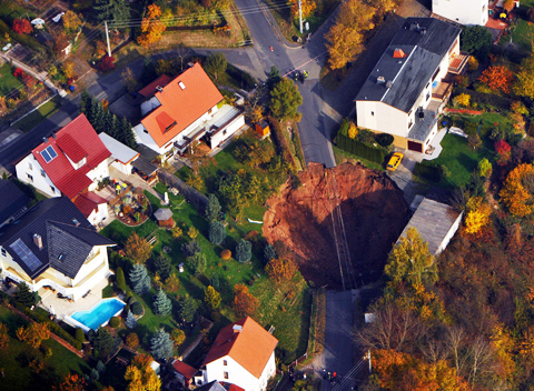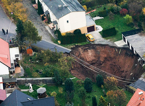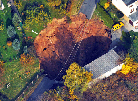 德国当地时间2010年11月1日,德国东部城镇施马尔卡尔登,一居民区发生地陷,形成一个巨大的“天坑”,一辆汽车被埋,另一辆车悬挂在“天坑”的边上。造成“天坑”的原因目前还不清楚,目前“天坑”周围23个建筑物里的居民已经被疏散,无人受伤。