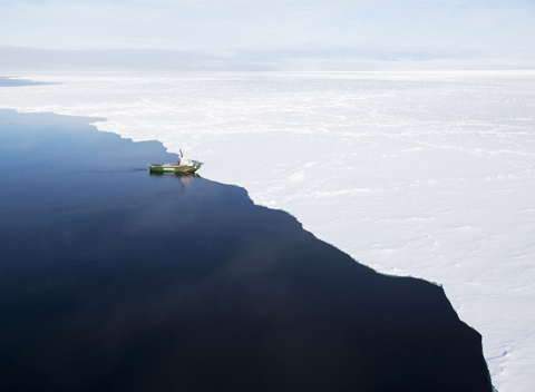 一条清晰的边界线显示了大片海冰向后“退缩”的身影。这里是加拿大边境附近的罗伯逊海峡。往年夏季,海冰通常会向前延伸进海峡里,但是由于近年来海冰急剧减退,“白色部队”再也没有抵达过海峡。