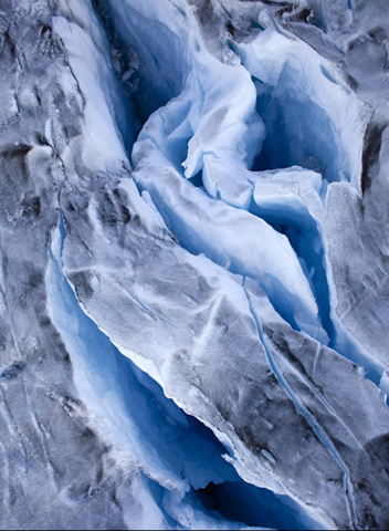 空中拍到的康格尔隆萨克冰川巨大的裂缝,显示了令人担忧的迹象:融速和流速越来越快。如果冰川有朝一日真的完全融化,将不会恢复,人类就会面临洪水与干旱同时来袭的悲惨命运。