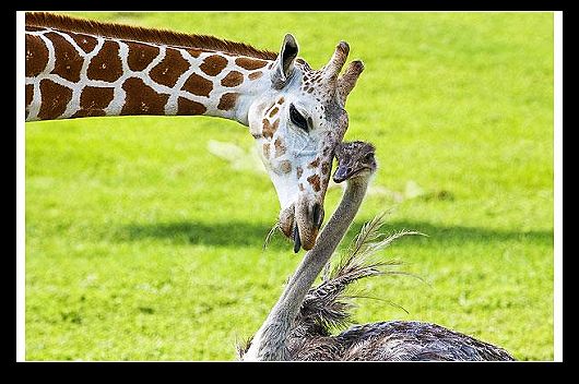在美国佛罗里达州坦帕湾的布施花园,三岁的长颈鹿Bea和鸵鸟Wilma结为好友。