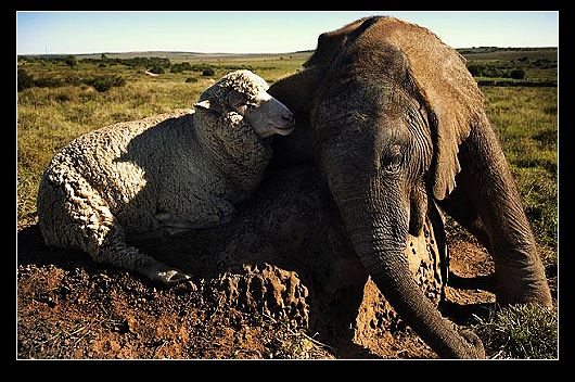 在南非,这只8个月大的小象Themba是个孤儿,它与绵羊Albert关系不错。