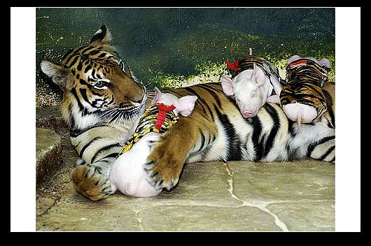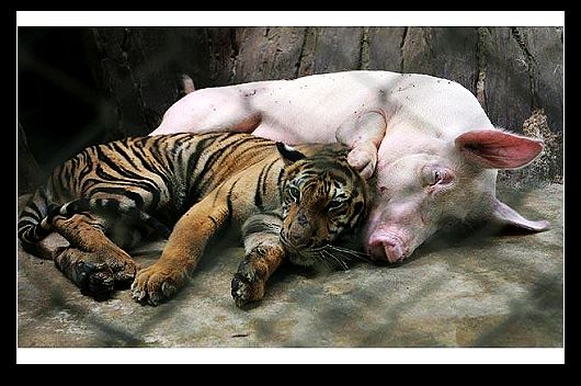 在泰国的诗提查老虎园,猪和虎仔“同床共枕”。