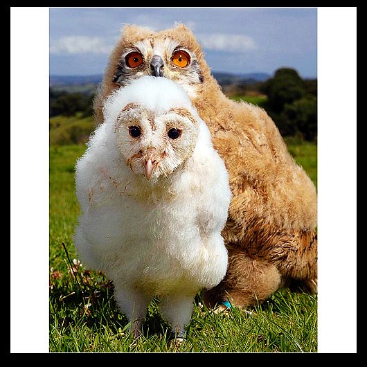 白色猴头鹰和这只“混血”雕鸮形影不离。