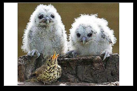 鸫通常是猫头鹰的盘中餐,但这只鸫却与小猫头鹰交上朋友了。