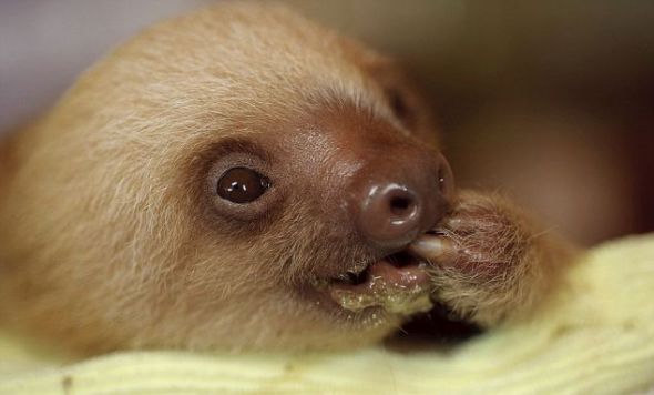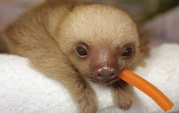 饥饿:这是被哥斯达黎加野生生物避难所营救的百只树懒中的一只,它正在开开心心地吃着美味胡萝卜条。