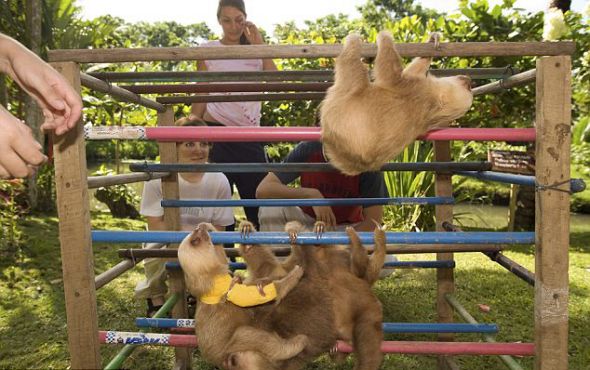 倒挂:树懒孤儿在该避难所进行常规训练。