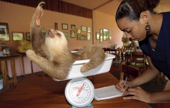 称体重:工作人员需要经常给树懒做检查,看一看它们的生长速度。