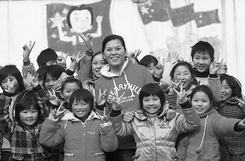 今年1月28日,被评为“2009年度感动中国十大人物”的河南周口淮阳许湾乡希望小学校长李灵,在学校和孩子们高兴地跳了起来。2009年6月,李灵为实现给孩子们搭建简易“阅览室”的梦想,在郑州街头四处奔波,推着三轮车高价收购小学生教辅课外读物等。陈晓东摄(资料图片)