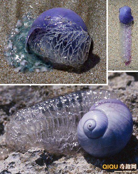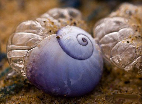 紫色海蜗牛是一种神奇的腹足。这种贝类动物的壳又薄又轻,一般为紫色、白色和淡蓝色,陀螺形。触角分叉,眼几近退化。这种动物的足部能够分泌出粘液而形成浮囊,它就是借助浮囊过着与众不同的既逍遥自在又充满风险的浮游生活。在远洋途中它通过拟态和保护色来达到防御敌害的目的,那蓝紫色的贝壳和大海混为一体,使敌人很难。