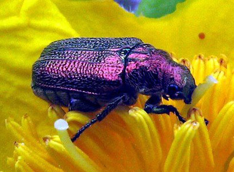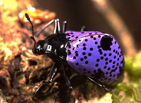 紫色甲壳虫非常罕见。在大多数情况下,这种甲壳虫显示的是并不是纯种的紫色,而是一种彩虹色。其实紫色帝王蝶也显示的是一种彩虹色。这种珠宝般美丽的昆虫显示的是一种混杂有蓝色、绿色和紫色的彩虹色。