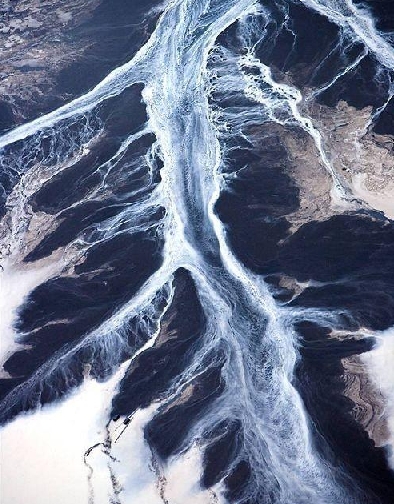 【地球的淤血 】 这张图片中羽毛状的泡沫是在铝土废料中形成的。铝金属是从铝土中提炼的。提炼时需要先用腐蚀性化学制品和大功率电流制造出氧化铝,而后电解还原氧化铝以得到铝。这个过程会从液态物质里分解出铝土的固体杂质。该图展示的就是对杂质的排放情况。