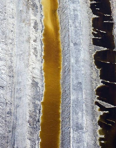 【黄黑】 这张图所展示的是用硫酸等化学成分制造磷酸盐原料时所排放出的具有放射性的酸性有害物质。这些化工物质沿着废弃肥料渠为大地抹上两道黑与金。它们会渗入地表水,而后污染到地下水。化肥是现代农业工业化革命的推动力之一。