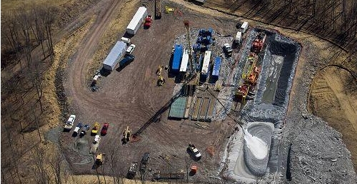【水力压裂钻探场】 这张图片所展示的是工人们在一处废坑中钻探泥浆。这些堪钻运作留下的副产品有大量的碎石,钻头润滑剂以及放射性物质。这种形式的“废坑再开发”显示了勘探开采的无休无止,没有穷尽。图片右下角的机械喷涂是违法操作,这将会威胁到该地段的地下水体。