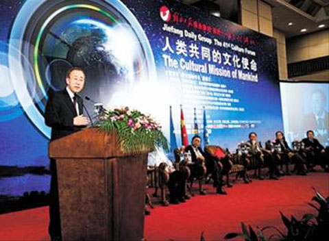 昨天上午,解放日报报业集团第41届文化讲坛书写了新的历史一页,联合国秘书长潘基文出席并在“人类共同的文化使命”这一主题下,发表了题为《以未来的名义》的主旨演讲,这也是历史上联合国秘书长第一次参加由媒体举办的文化活动。在昨天的文化讲坛上,潘基文秘书长首先从全球角度对“多元文化”作了阐述。他说:“我们生活在一个发生巨大变化的世界,这个世界的连接越来越紧密,文化的多元性变得越来越重要。文化多元性是联合国的一个首要事项,也是全球社区首要的事项。”在他看来,多元文化是机会而不是威胁。演讲过后,他还与袁隆平、余秋雨、韩美林、赵本山、海岩、崔永元等同台对话。