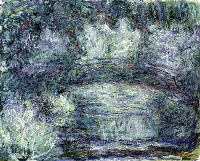 有人说艺术可以分为四个层次:艳俗、含蓄、矫情、病态。所谓艳俗,不用解释,最广为大众接受的即是;含蓄,比如诗歌,比如散文;矫情,毕加索、海明威,也许还有钱钟书?病态,就是最高级的艺术,如达利、梵高,还有莫奈!他们的解释是,莫奈是精神病早已被确诊,而只有疯子才能创作出那样的日本桥,远看是桥,近看全是疯狂的线条。