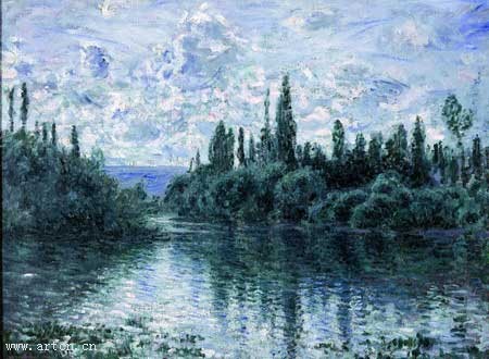 《塞纳河畔,韦特伊附近》是莫奈1878年创作的画布油画。1878年至1881年间,莫奈住在贝特维尔。这是一座位于巴黎和鲁昂之间的小城,莫奈的房子正好在塞纳河边,周围是一片美景,为他捕捉一年四季的光线变化提供了绝妙的环境。莫奈在贝特维尔完成的对塞纳河的观察,说明他对研究同一物体在不同光照条件下产生的变化不定的效果怀有极大的兴趣,并且为他20年后完成的《睡莲》系列大作埋下了伏笔。此外,逐渐远离巴黎喧嚣的现代化生活,也让莫奈集中精力专心探究同一景色的各种变化。这种归隐的生活方式表明,莫奈对描绘一个地方特殊自然环境的各种不同景象,怀有极其强烈的兴趣。