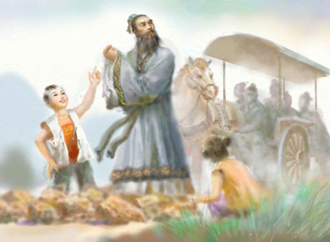 项橐惊道:“您就是鼎鼎大名的孔夫子!那么我请教您三个问题,答的出来我就让城让路,答不出来就请绕城而过”。