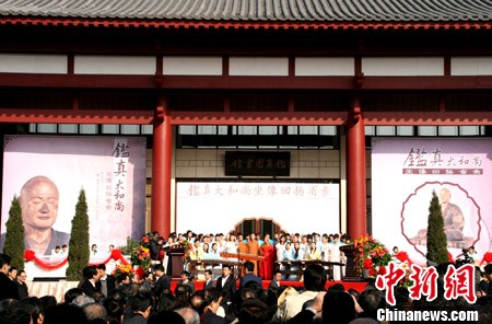 26日,扬州在大明寺鉴真图书馆隆重举行日本东大寺鉴真坐像回乡“省亲”揭幕仪式。崔佳明 摄