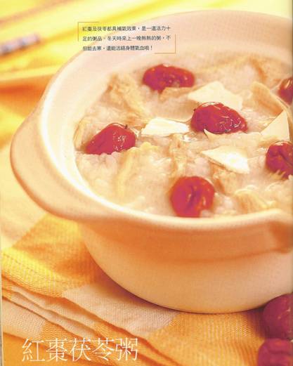 材料:米1杯,红枣10颗,茯苓6钱,素鸡肉丝适量,盐小许