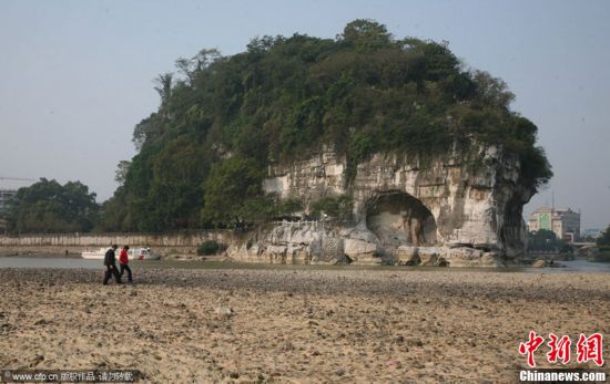 2010年11月4日,广西桂林,象鼻山前干涸的河床。入秋以来,桂林持续干旱,漓江水位下降,进入秋冬枯水期。