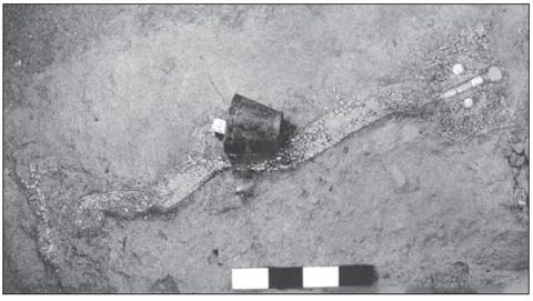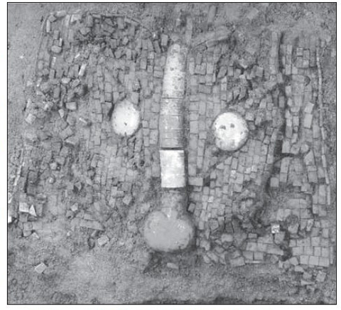 绿松石龙形器,最初是在2002年清理河南省偃师市二里头遗址的一座墓葬时发现的。这座墓葬位于二里头遗址宫城内3号宫殿基址的庭院中。墓口长2.24米,宽约1.1米,残深0.5~0.6米。墓内葬一位30~35 岁的男性,随葬有1 件鸟首玉饰,2件穿孔绿松石珠,90余枚穿孔海贝,3件漆器,分别为觚、形器、带柄容器以及爵、、鼎、豆、尊、盆等10 余件陶器,最重要的是绿松石龙形器及其铜铃与玉铃舌(图1-1)。