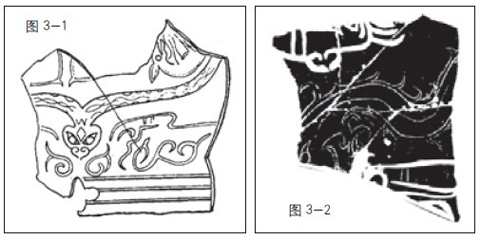 又如20世纪60年代初在二里头遗址出土的两件残陶器上刻画有龙形图案。一件刻纹较深,为一头二身,已残缺。头朝下,梭形眼,凸鼻,龙首特征与绿松石(图3-1)。另一件刻纹较细,龙首残缺,可辨有龙首部的眼,弯曲的龙身与长尾,飘龙首接近辨有龙首部的眼,弯曲的龙身与长尾,飘逸的鬣和张扬的龙爪(图3-2)。