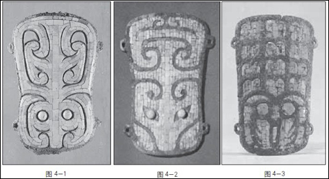 另一类是以绿松石片为主组合或镶嵌形成的龙遗存,称为绿松石系列。如1981年在二里头遗址Ⅴ区M4 号墓葬中出土的一件绿松石铜牌饰(81VM4:5),平面呈长圆形,中部内收。在铜牌饰上面,以不同形状的绿松石片粘嵌组合成以兽面纹为主要特征的动物纹样(图4-1),长14.2厘米,宽9.8 厘米。1984 年在二里头遗址Ⅵ区M11号墓葬中出土的1件绿松石铜牌饰(84 Ⅵ M11:7),也是平面呈长圆形,中部内收,并在铜牌饰的正面铸成兽面纹轮廓,再以绿松石片粘嵌,长16.5 厘米,宽8~11 厘米(图4-2)。1987 年在二里头遗址Ⅵ区M57号墓葬中出土的1件绿松石铜牌饰(87 Ⅵ M57:4),平面呈圆角梯形,以青铜铸成兽面纹镂空框架,在铜构镂空框架内镶嵌绿松石片,长15.9 厘米,宽7.5~8.9厘米,厚0.25厘米(图4-3)。这类绿松石铜牌饰,还见于一些海内外博物馆的早期收藏品。