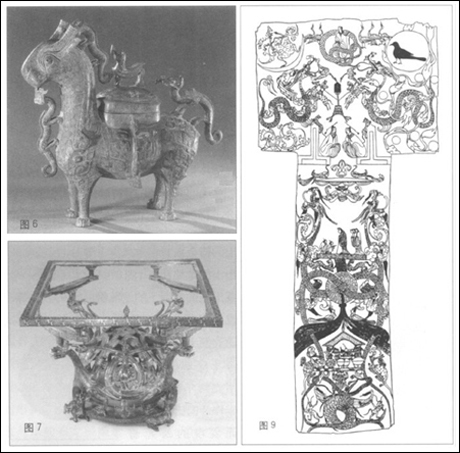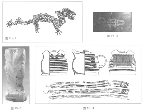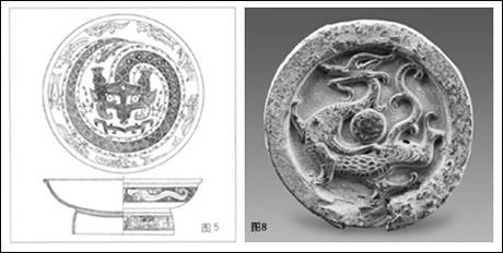 中国古代龙文化遗存,种类繁多。以前发现的商代至明清时期的龙文化遗存十分丰富。早期的如商代妇好墓出土的蟠龙纹铜盘(图5)、西周井叔墓地出土的青铜牺尊上的龙铸件(图6)、东周中山王墓出土的错金银青铜龙凤案(图7)、汉长安城出土的龙纹瓦当(图8)、西汉马王堆一号墓出土的帛画上的龙图案(图9),等等。汉代以后的龙文化遗存更是丰富,如帝王穿戴的龙袍,清光绪年间将龙图案作为国旗图案等。而发现的公元前2000年以前的龙文化遗存也较多,如河南省濮阳市西水坡遗址发现的公元前4000年前后的蚌壳摆塑龙(图10-1)、良渚文化的龙首玉雕(图10-2)与龙纹陶器(图10-3、10-4)、山西省襄汾县陶寺遗址发现的彩绘龙陶盘等(图10-5)。仅是缺商代之前、陶寺文化之后的夏时期的龙文化遗存。二里头文化绿松石龙形器的发现以及一批龙文化遗存的辨识,填补了这个缺环,使得中国龙文化遗存从公元前4000年前后至现今的连续发展演变的线索,得以清晰地揭示。