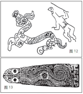 这则文献记载说明我国古代在舜虞及夏时期曾有过驯养龙的史实,其驯养的龙,应是鳄鱼。这种驯养鳄鱼的情况,还见于青铜器纹饰上。如收藏于日本的一件战国青铜卣上有豢龙纹图案(图12),其龙图案应为鳄鱼;山西石楼桃花庄出土的一件商代龙形铜觥,为鳄鱼状。(图13)。