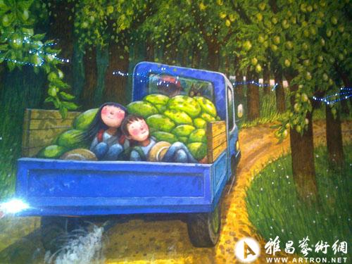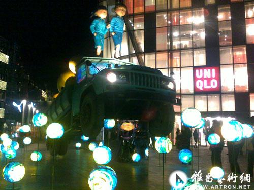 图为整个三里屯VILLAGE已成为幾米绘本世界的一部分,4件用汽车改造的大型户外装置作品打造出主题概念:沿着银河向上行驶的汽车,载满梦想的兔子货车……