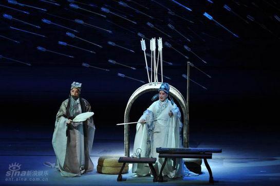 在奥运会和残奥会上火了一把的舞蹈导演张继钢跨界导演《赤壁》这出京剧,有意把舞台美术往舞蹈和影视上引,其阵容强大,制作豪华,光是铜雀台盛景,火烧赤壁壮观,草船借箭梦幻,这几处景的装置,就足够金碧辉煌,格外恢弘了。真有点儿不惜千金买宝刀,貂裘换酒也堪豪的劲头。这是近年来戏剧革新都要唱的前奏曲,都愿意走这样一条奢华之路,似乎出新就得表现在老虎的后背、鸟的翎毛这样的外表一眼看得见的地方。