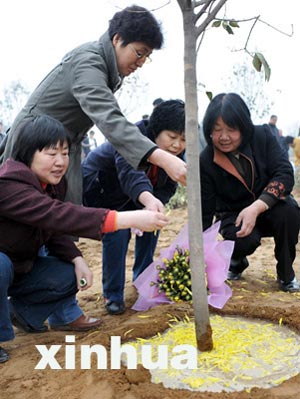 参加“树葬”活动的几位市民将菊花瓣撒在掩埋亲人骨灰的绿树旁.记者王颂摄