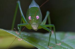 新几内亚的科考新发现了20种新的螽蟴科昆虫,其中包括这种浑身绿色,眼睛粉红的品种,吸引了最多的目光。但这种纺织娘可是非同一般。它长着长满刺的粗壮后腿,武装到牙齿。当它遇到威胁,它会抬起后腿往前伸出,猛戳潜在的攻击者。发现它的科学家们由于对这样的攻击方式一无所知,所以充当了一次试验品,也着实体会了一次它的厉害。