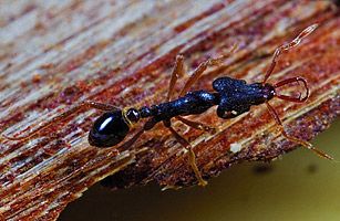 这是科学家们最近在巴布亚新几内发现的超过200种新物种之一,这种树蚂蚁在海拔2900米处安家。在这一海拔高度,空气开始缺氧,环境相当恶劣。生活在这里的蚂蚁必须同时适应炎热干燥和寒冷潮湿的环境。它们采取的方法是降低新陈代谢的强度,以便更好地利用所吃下的食物,而它们有力的下颚则有助于它们提高猎物的捕获成功率。它们的颌骨张开180度,用前端的触须仔细感受动静,即便最轻微的动静就会让它们立即合上嘴巴。那些路过的昆虫们可就遭了殃了。