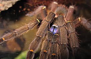 接下来的这种生物几乎一无是处。它早在十年前就在法属圭亚那被首次发现,但直到今年才被正式宣布。它体长2.5~8厘米左右,浑身长满刚毛,对于蜘蛛来说,这是很大的体型。更加令人脊背发凉的是,它喜欢捕食鸟类,这完全颠覆了传统意义上“鸟类吃虫子”的自然顺序。不过它们的牙齿看上去是蓝色的,像是一块蓝宝石,很漂亮——不过这可能也就是它唯一的优点了。