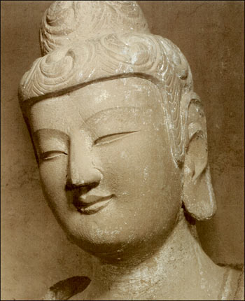 佛教文化中的“拈花一笑”,意味着顿悟和升华,这种智慧的微笑,多见于我国云冈、龙门、敦煌等石窟的壁画中。美学大师李泽厚认为,这些热烈激昂的壁画故事,衬托出的是异常宁静的主人;他们长脸细颈神情奕奕,衣裙繁复而飘动,以洞察一切的睿智的微笑,阅尽人间烟火。