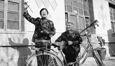 张宝庭抱起三弦,妻子杨文芝将书鼓放在自行车后座。两人一弹一唱。悠扬的曲子、铿锵的唱词,立刻唤醒了寂静的乡村。