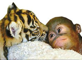 在印度的塔曼野生动物医院,两只野生苏门答腊虎和两只野生猩猩成了朋友。这种友谊注定不会长久,幼虎长到三个月时开始吃肉,那时他们就得跟自己的新玩伴分开。