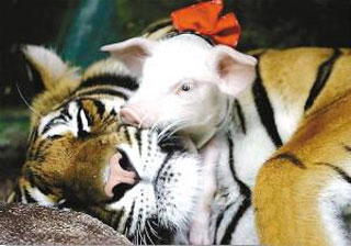位于泰国海滩度假胜地芭堤雅的Sriracha老虎园就发生了怪事,一只母老虎养育着一群小猪。