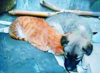 猫和狗一般不会相处的,网友却在街边发现一只流浪猫和一条被遗弃的小狗挤在一个废弃的角落,相互取暖抵挡寒流,实属罕见。