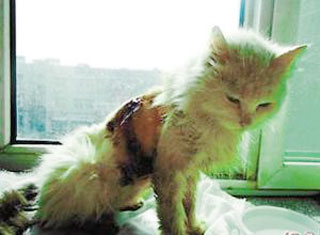 背部遭铁钩刺穿,腹部两侧的皮毛都已空缺,仅脊背处还有一点皮毛留了下来。11月2日,济南市民岳淑芹救助了这样一只猫咪,强强。宠物医生估计是烤羊肉串的人先用钩子把猫勾起来,然后从身子两边各拉一刀,活剥了这只小猫的皮。