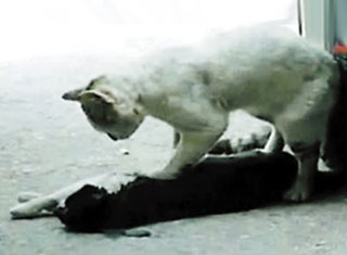 土耳其一只流浪小猫在停车场被汽车撞倒后,无助地躺在地上,同伴随后赶来,用猫掌在昏迷的同伴胸口上心脏按摩,整整2个小时,希望它能够醒过来。