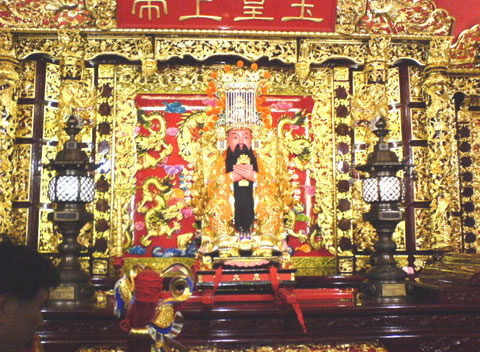 说到玉皇大帝,民间莫不将他看成天上的“皇帝”,万神世界的最高统治者,神仙佛祖一律都需要听命于他。实际上,就道教的神仙谱系来说,玉皇的地位低于三清(三清即玉清元始天尊、上清灵宝天尊、太清道德天尊,为道教所崇拜的最高神)。其实,玉皇大帝这一至上神的形象,是宋真宗的崇道活动的副产品。中国传统的观念中,至上神称为帝、上帝,亦称为天,在儒家祀奠中又作是昊天上帝。对他的座次排位,宋以前的道教中是很忽略的。宋真宗为了宣布自己的祖先赵元郎是道教尊神之一便借着玉皇的名义演了一场“天书”下降的闹剧。为了尊祖(实在是生造出来的)也连带着尊玉帝,上尊号为“太上开天执符御历合真体道玉皇大天帝。” 这是玉皇大帝崇拜普及的开始,不过玉帝在道教内部仍是只听命于三清的。《高上玉皇本行集经》叙述玉皇的来历说,太上道君(三清的第二位)将一位“身诸毛孔放百仪光”的婴儿送往光严妙国的宝月光皇后怀胎,产下皇太子,修道三千二百劫,才证位金仙,称“清净自然觉王如来”,又经亿劫,才证位玉帝。这种编造的仙话固然不足信,但玉皇在道教中为在三清之下却是很清楚的。然而,民间对玉皇大帝和三清关系并不怎么了然,凭着生活经验,地上的最高统治者是皇帝,佛教、道教的领袖哪怕封了国师、天师,也还得听命于皇帝,所以在民众心目中,在神仙包括佛菩萨的世界中“最大”的是玉皇大帝。所以对他的祭祀要用最高规格了。清代著名诗人龚自珍有一首名作:
