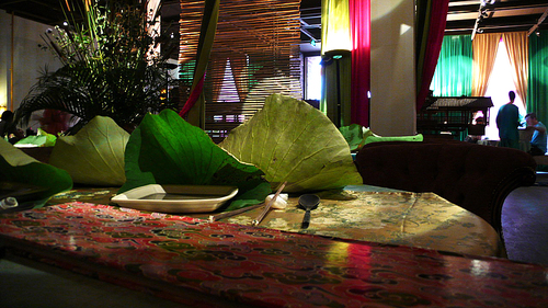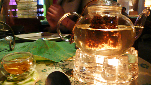 琵琶花茶杯子里还放了一朵「金莲花」透明玻璃的茶壶很有美感,同时充当了照明。餐具也很雅致,每个人的餐桌垫就是荷花叶,是真的而且不是干的!