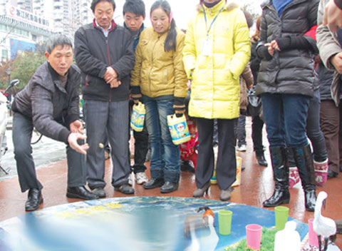 在活动现场,记者发现,最受群众欢迎的是湿地生活趣味游戏。该游戏的道具是一块湿地模型图,上面分布着野鸭部落、红木林、丹顶鹤栖息处等区域,参与者需将手中的花生投入相应杯子中,投中者既可获奖品一份。记者注意到,无论是老人还是小孩,每一个到现场参加活动的人都被这趣味游戏所吸引;而每当有人玩游戏时,旁边都会围站着一群人观看。