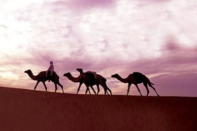 走啊,走啊,从早晨走到中午,又从中午走到黄昏,坐在骆驼背上的人们已经疲惫不堪了,而只有骆驼还在一步一步地走着,没有一点躁动,没有一点厌倦,就是那样走着,默默地忍受着命运为它们安排的一切。